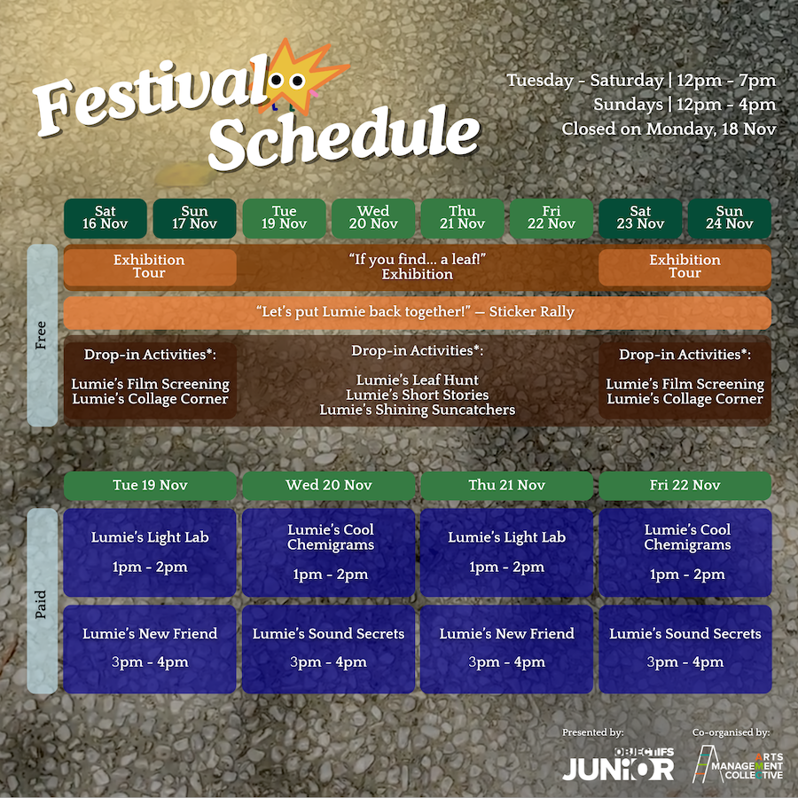 This year’s theme, “If You Find…a Leaf”, follows the journey of Lumie, our bold and bright mascot, to reunite a fallen leaf with the tree it came from. Children (and the young at heart) will get to participate in a vibrant array of interactive workshops and artful participatory experiences designed to spark curiosity and creativity, empowering them to see the world through a new lens.