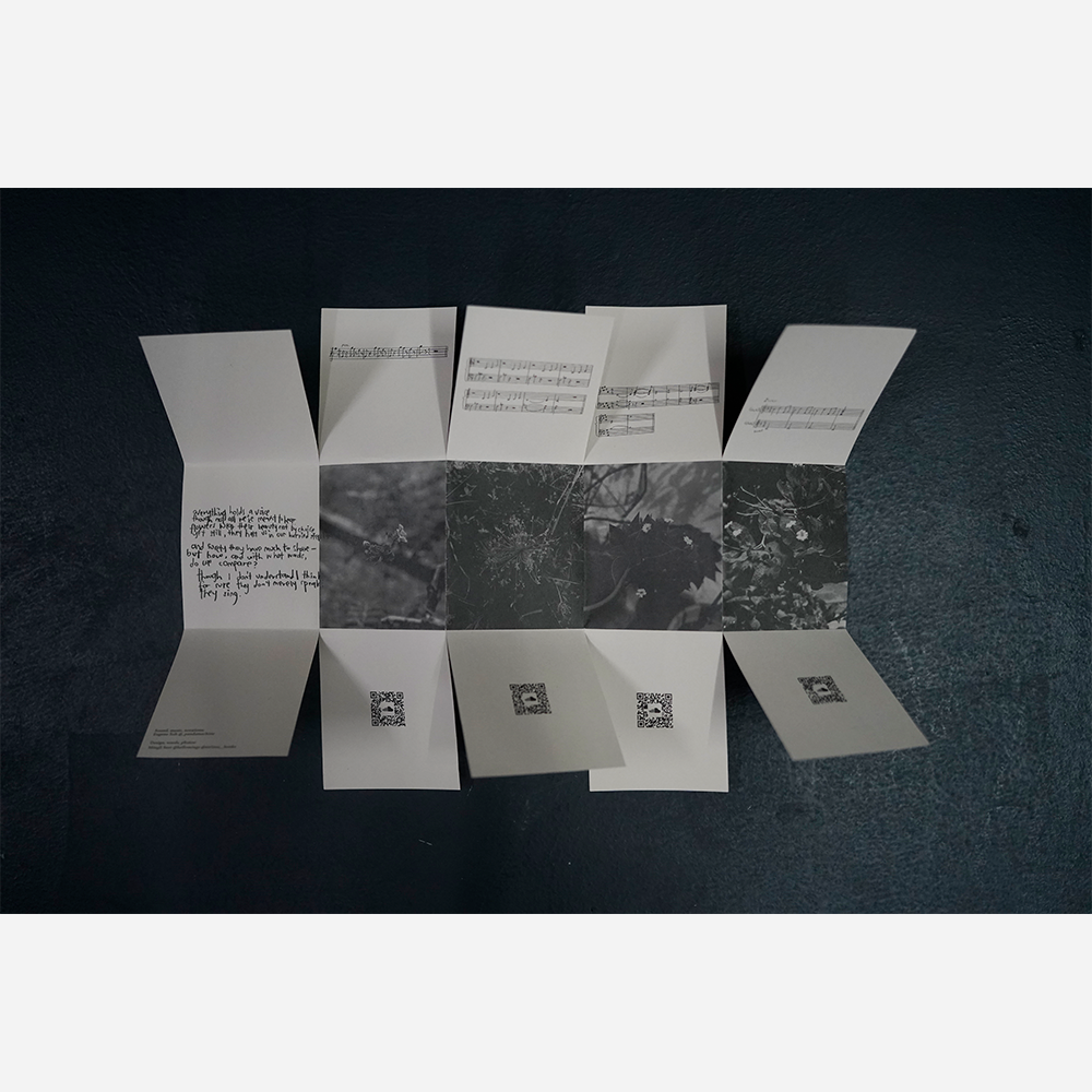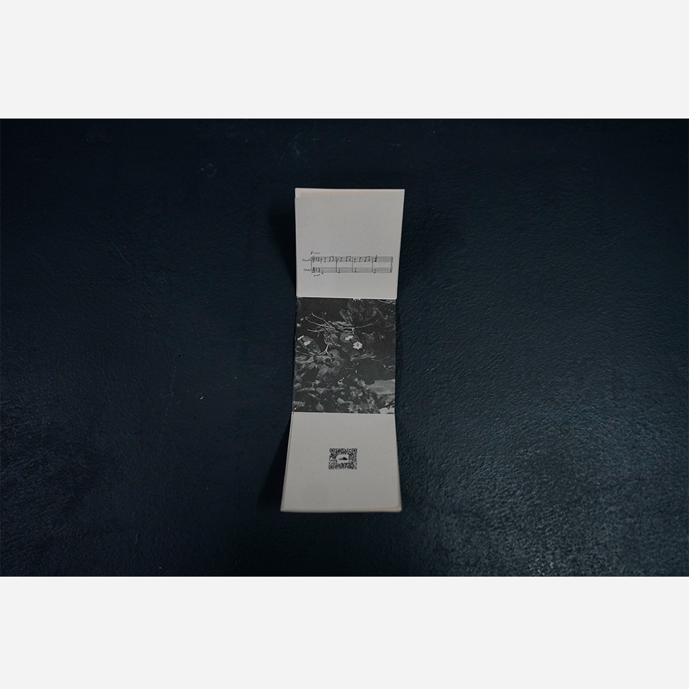 This zine is like a lyric booklet of sorts, but without any words. And the artist is not a person, but nature itself. Opening up to A3, the zine is folded in a way that lets you read it continuously, without end. Inside, you’ll find photographs of flowers I’ve come across on my walks around Singapore – each quietly existing, yet too striking to pass by without capturing as a memory for the road. Accompanying these photos are musical compositions composed, recorded, and notated by Eugene Soh (@_pandamachine).
