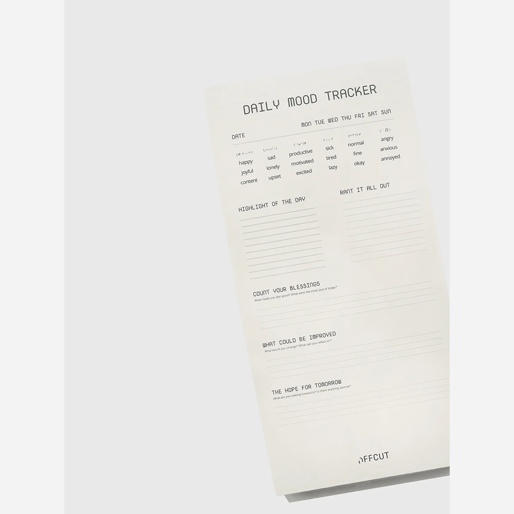 – Approximately 100 sheets – Rectangular portrait pad with a tear edge. – List of dates and moods. Single-lines grids for different notations. – please note that all OFFCUT products are made from salvaged materials from the local printing company, therefore the texture, colour of the paper varies from batch to batch. The company also updates its designs from time to time to fit the material and paper quality available at the time of production, which made each pieces unique and irreplaceable. This unique is the soul of the brand and its products. |