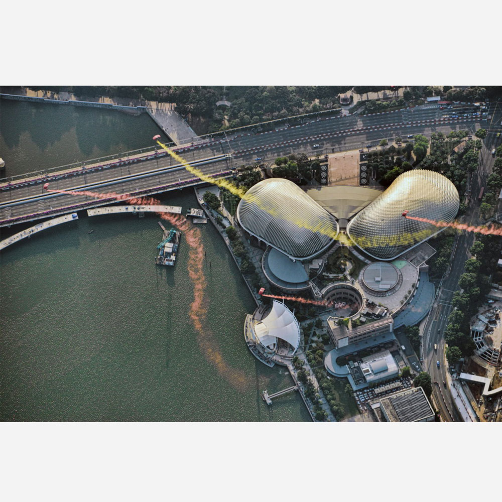 Taking photography literally to new heights, Richard photographed the ends of Singapore from the air by helicopter, for the book Over Singapore (launched in 2015, by Editions Didier Millet). In one of the most extensive aerial photography projects in Singapore, shots were taken from as high as 10000 feet above sea level, from both military and civilian helicopters. Rare aerial photos of surreal and unusual scenes of the extremities of Singapore are presented. Quaint illusionary faces can also be seen in the myriad of industrial and urban development interlaced with gardens and naturescapes. The blend of old and new in the city core, outlying islands with coral reefs and even the Red Lions in action, are also all seen from a new perspective.