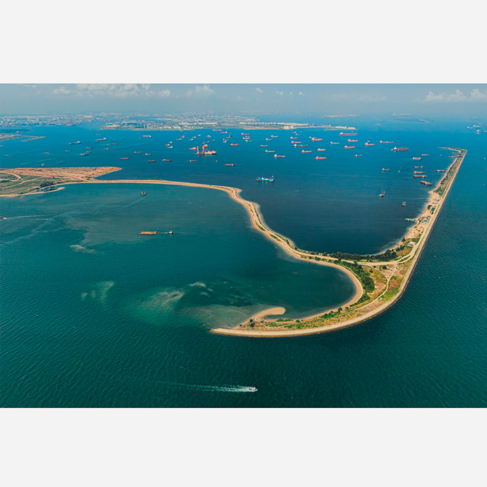 Helicopter aerial photo of land reclamation for Tuas Mega Port.