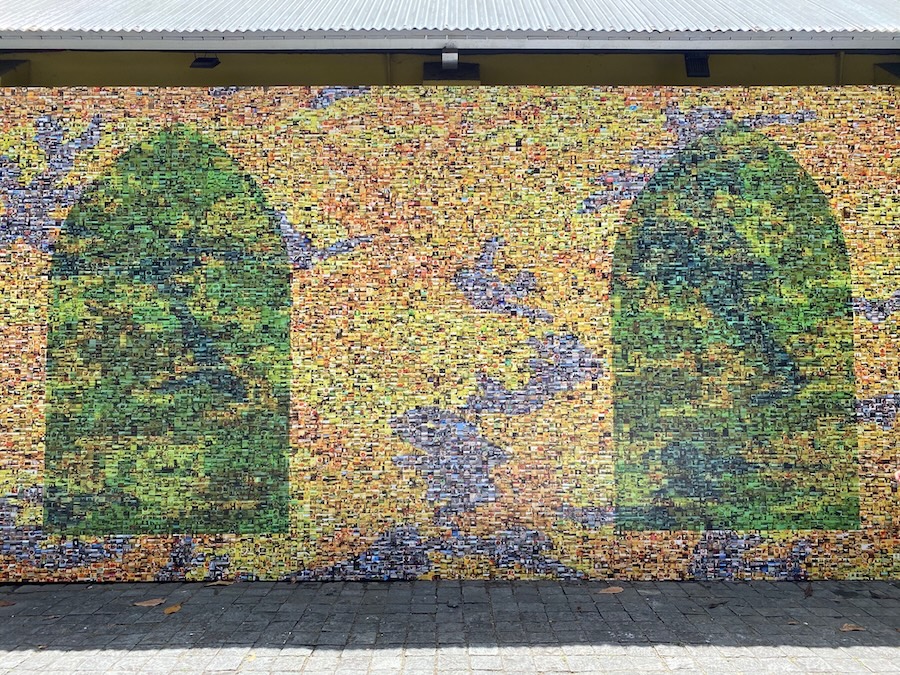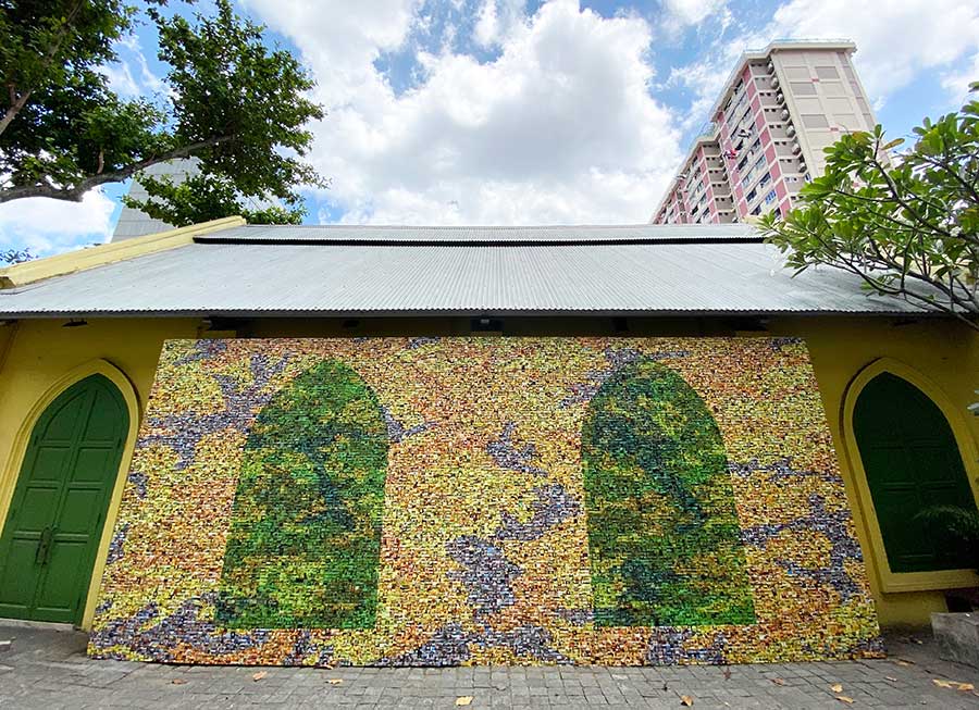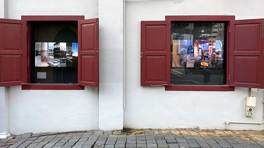 In displaying the images on hoarding erected along the side of the Chapel Gallery at Objectifs, Shroud further considers issues surrounding surveillance. Hoarding is a familiar sight in Singapore, given the high rate of urban renewal in the country. In Shroud, hoarding simultaneously conceals and reveals, by obscuring part of the building, while baring its base architectural features through the artwork. Similarly, the work invites its audience to consider notions of hiding in plain sight – Elahi’s extensive image tracking project industriously documents his meals, locations and activities, yet reveals surprisingly little about the artist himself.