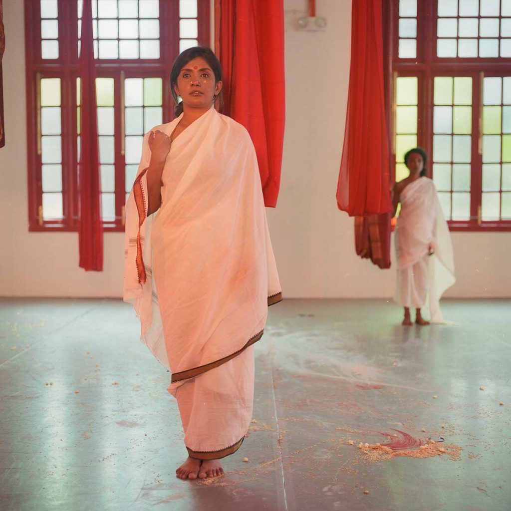 The colour white dominates the film, particularly in the dancers’ costumes. Aarthi shared: “We’ve always been enamoured with how gendered objects can be. As seen in our process documentation, we started out wearing more conventionally feminine sarees — we tried out bright colours, dark ones, white, black…”