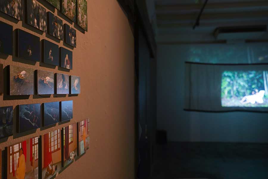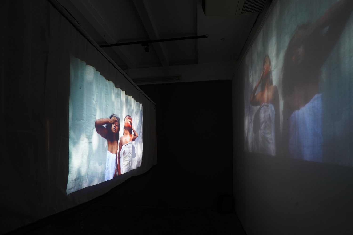 In Objectifs’ Lower Gallery, the film is projected onto and through a veshti belonging to Aarthi’s late father. For Amrita, the secondary projection onto the wall behind the veshti alludes to the multifaceted nature of the film itself.