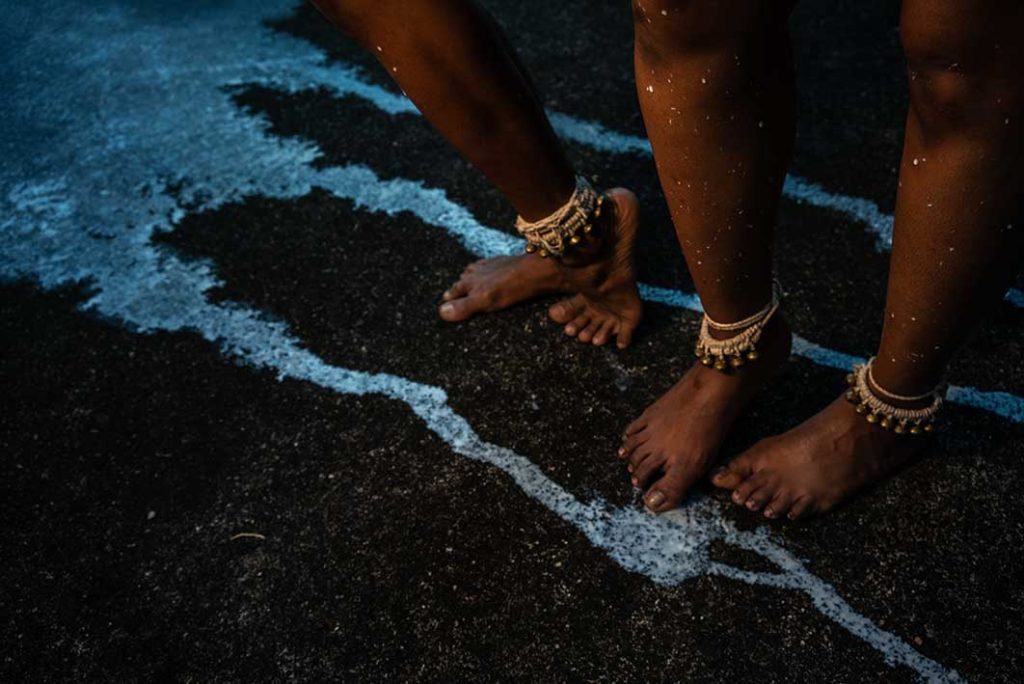 The artists experimented with performing their footwork on different surfaces and atop different elements – not only water, but also on milk, which is used in rituals where it is poured over religious idols as a form of offering and cleansing, and which some question as a wasteful practice that ignores the needs of individuals who could consume the milk. At the same time, Ruby highlighted how she finds it interesting that deities, including female goddesses, are shown off to the public while they are undressed and bathed in milk — the sight can be quite intimate and erotic. Ruby found it interesting that this part of the process was visible to devotees and then the altar would be closed and reopened for a grand reveal of the idol cleaned up and adorned in fine clothes, jewellery and fresh flowers.